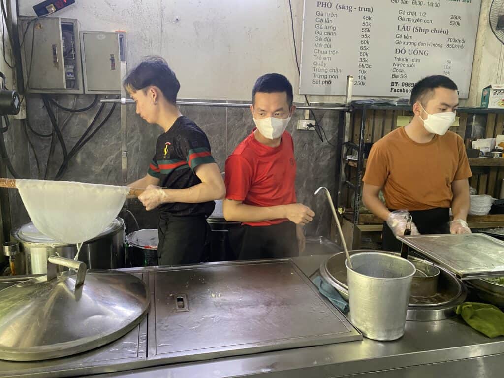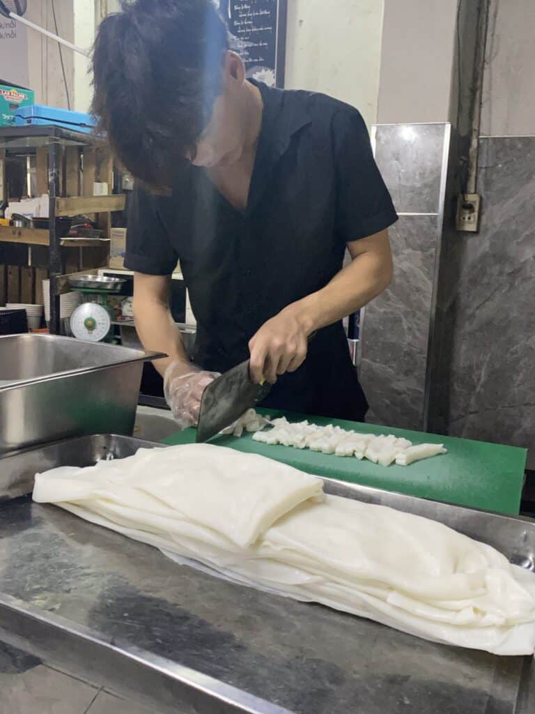 Here, they have fresh phở noodles made on-site. They steam rice sheets like bánh cuốn, hang them on steel rods to cool, then stacked and hand-cut into wide, substantial strands. It’s labor-intensive work that you would expect to see from shops that only specialize in making phở noodles, but here it’s non-negotiable.